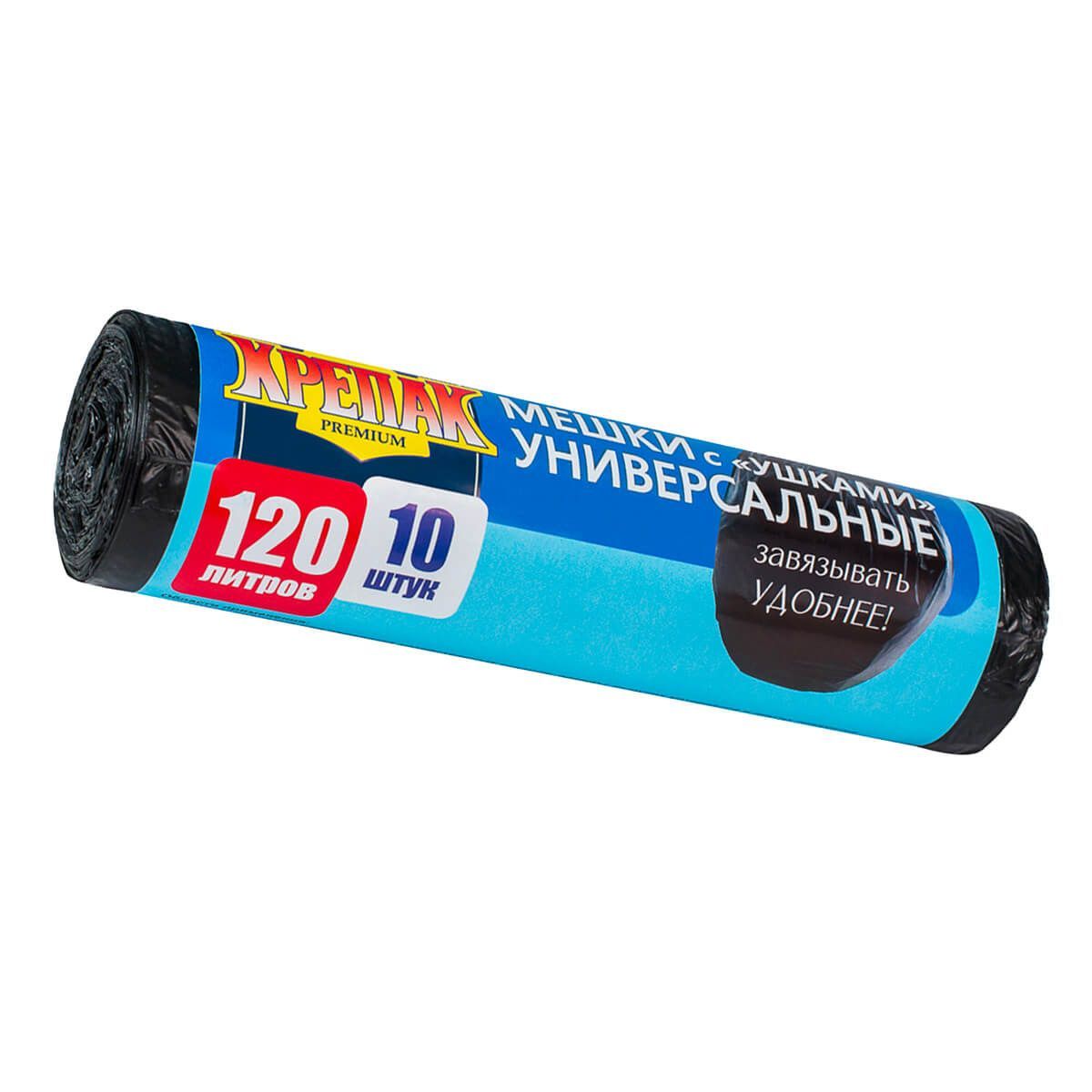 Мешки для мусора 120 л, с ушками, черные, в рулоне 10 шт., ПНД, 15 мкм, 1100х700 мм, Крепак, 4607075710474