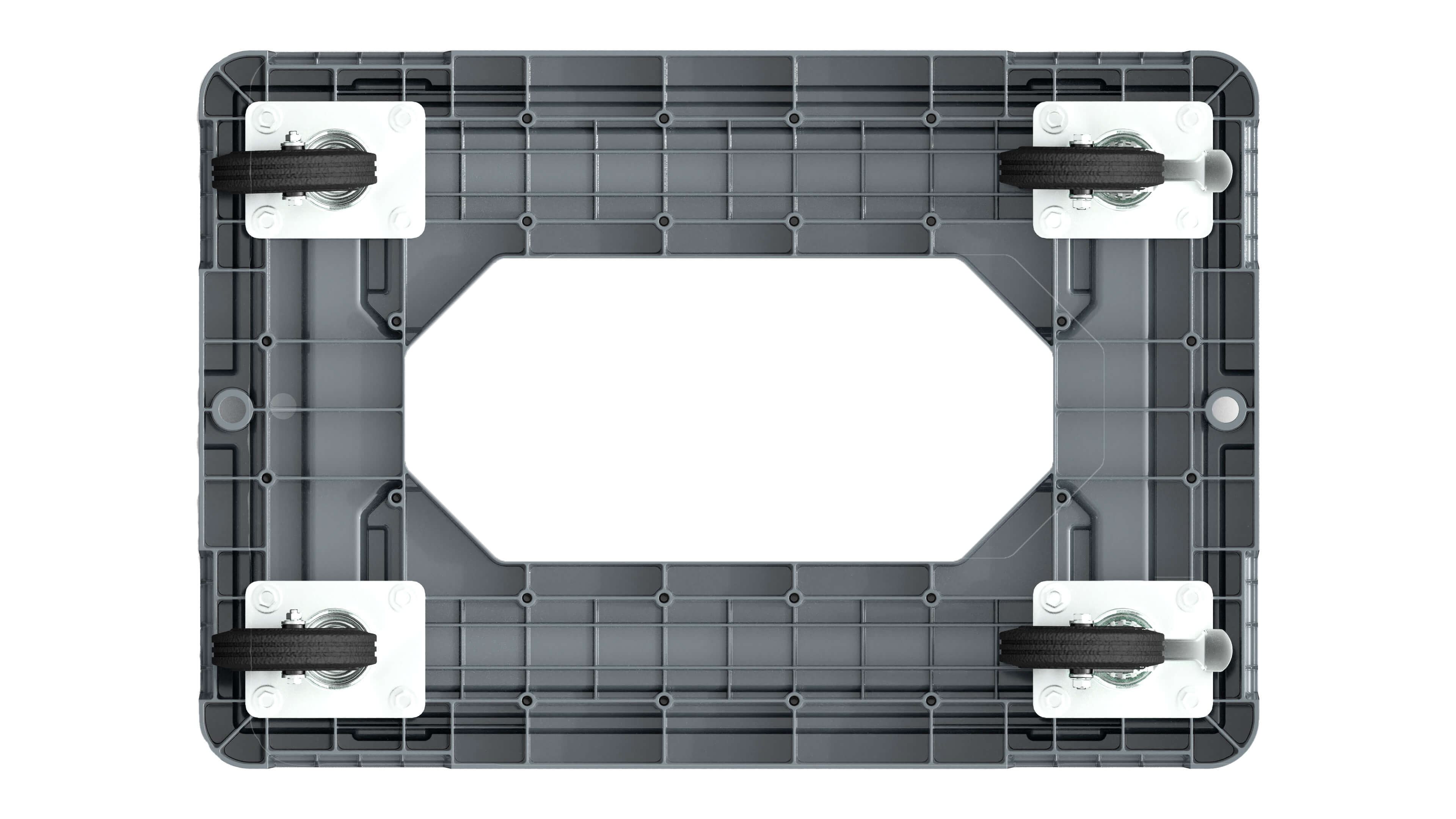 Конструкция тележки разработана с особым акцентом на прочность и надежность. Она сплошная и имеет усиленное место для захвата, позволяющее удобно манипулировать тележкой крючком. Большое количество ребер жесткости обеспечивает ей допустимую статическую и динамическую нагрузку до впечатляющих 300 кг.