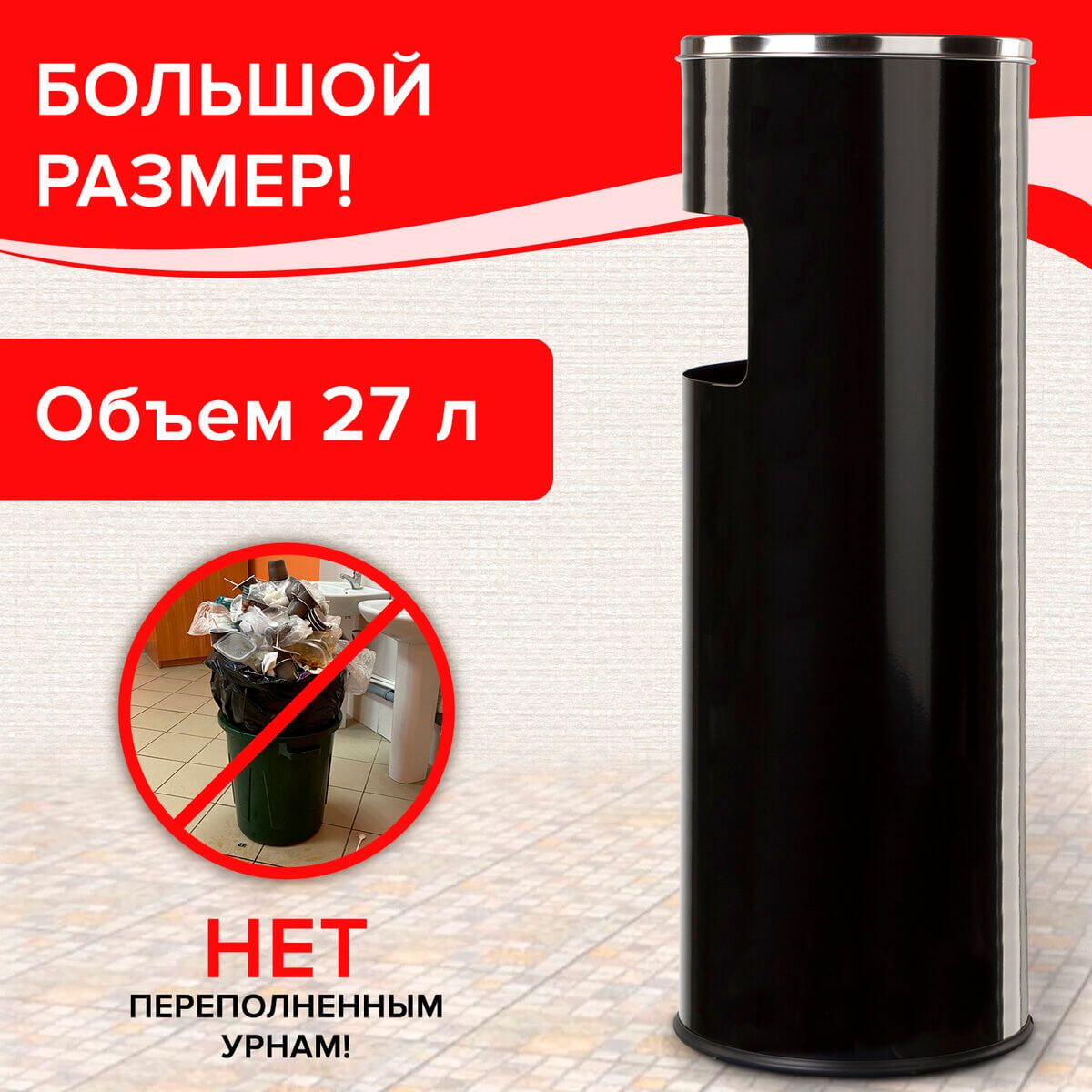 Изготовленная из элегантной нержавеющей стали черного цвета, эта урна не только привлекательно выглядит, но и обладает надежной структурой. С вместимостью в 27 литров она готова взять на себя ответственность за поддержание чистоты как внутри помещения, так и на входе в здание.