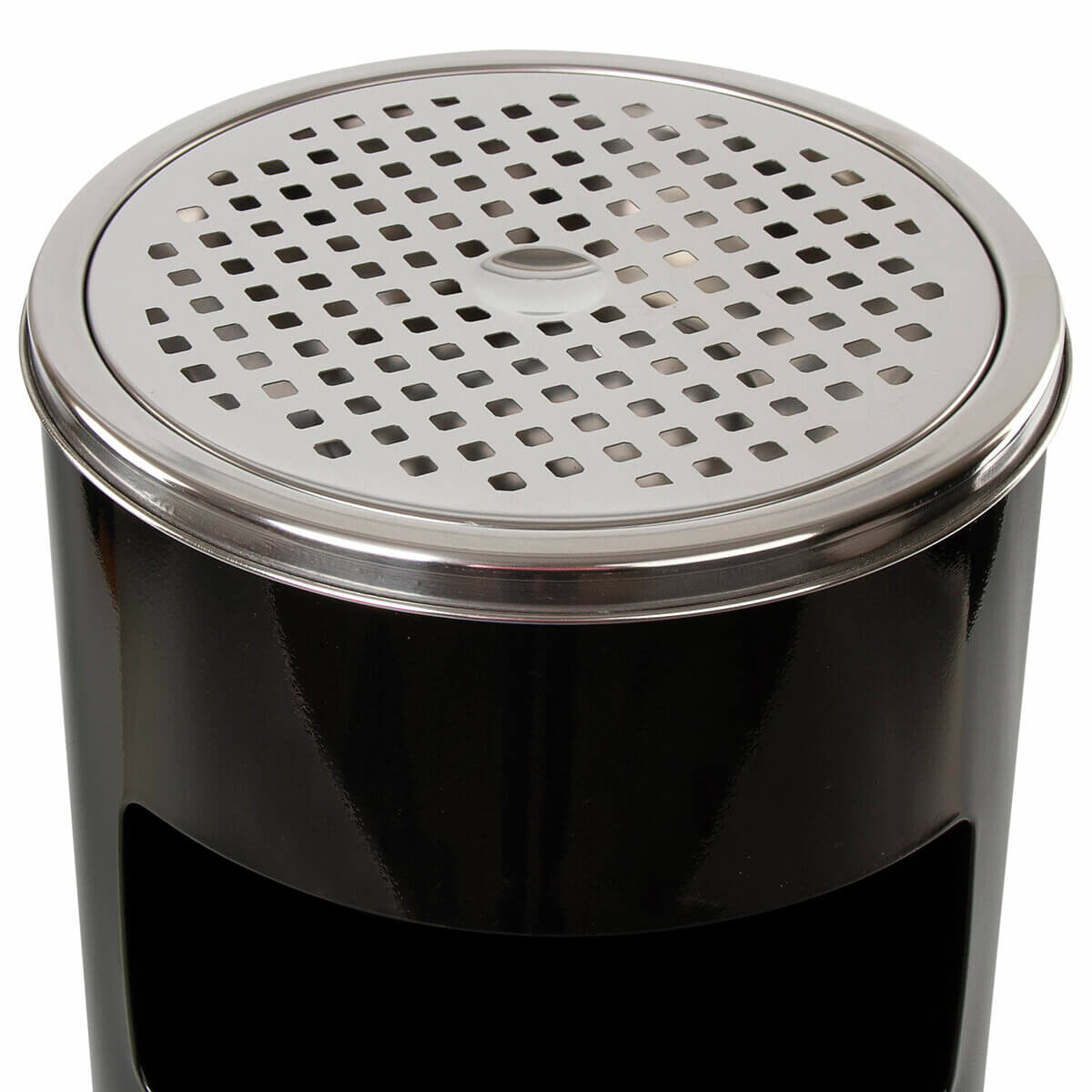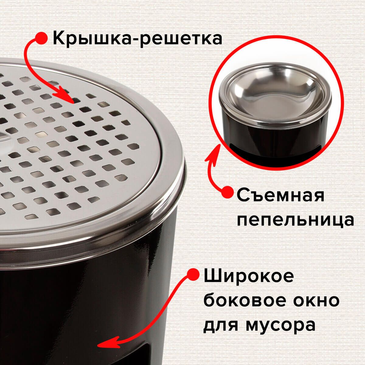 Интегрированная пепельница с крышкой предотвращает попадание горящих окурков и пепла внутрь урны, обеспечивая безопасность и предотвращая пожары. Боковое окно упрощает процесс сброса крупных предметов.